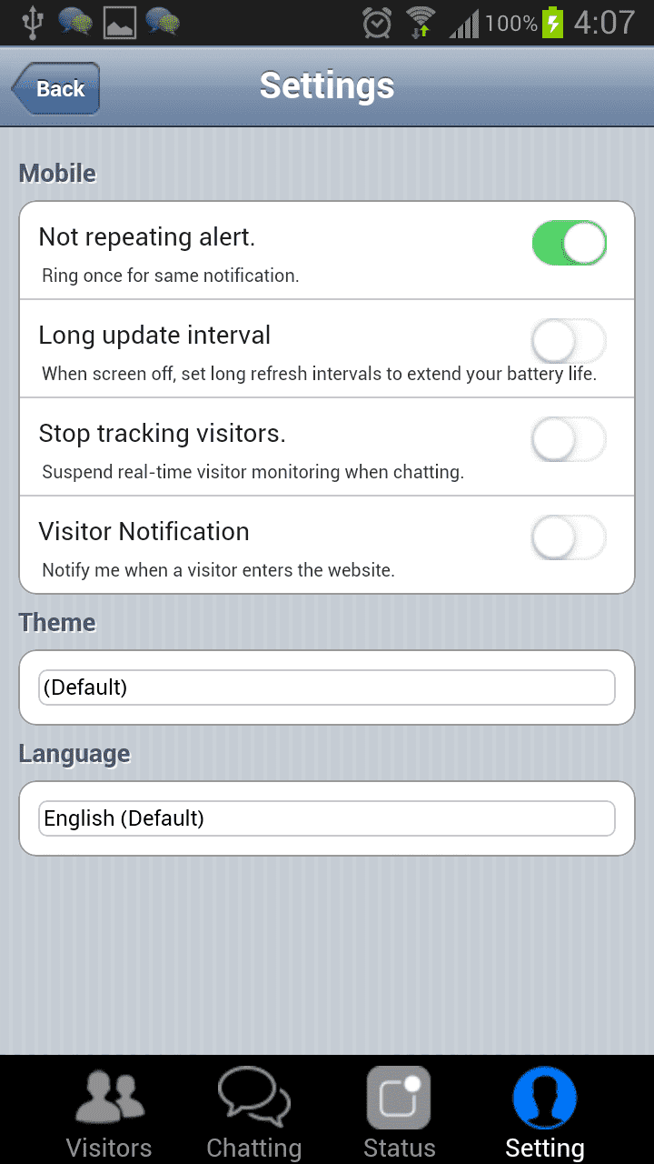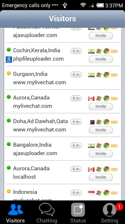 The application for IOS/Android devices includes all essential features for effective communication with your website visitors. The major features include real time traffic monitoring and chatting, chat invitations. The application will notify you of the new incoming chats even if you close it, unless you sign out of the system.